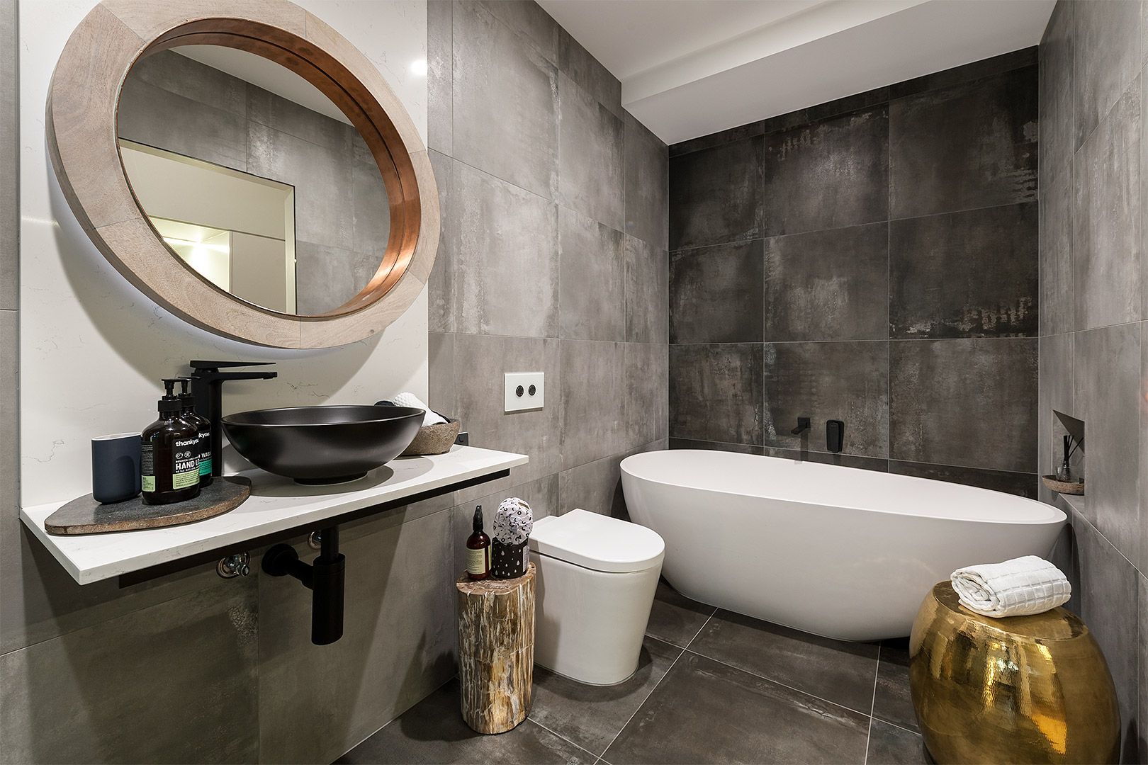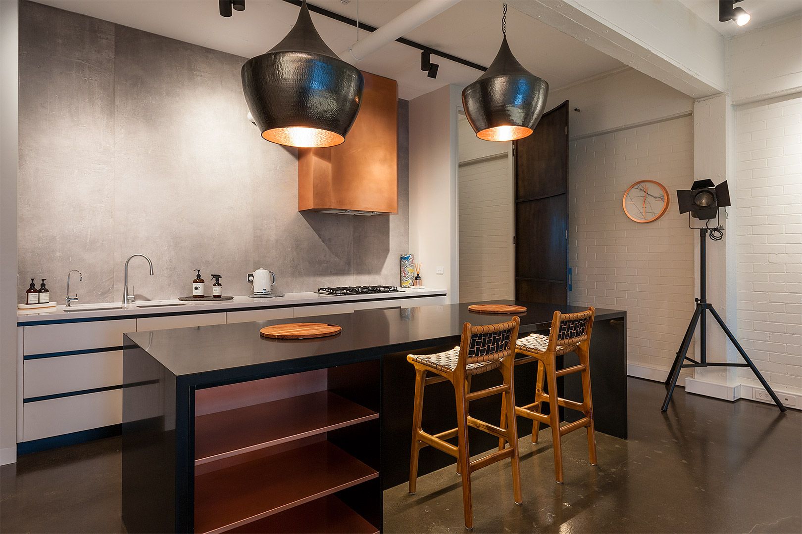 Showcasing a custom design fitout, including cool copper light fittings and range hood, imported Italian tiles, very rare Silestone benchtop, custom built steel doors, Miele and Smeg kitchen appliances.