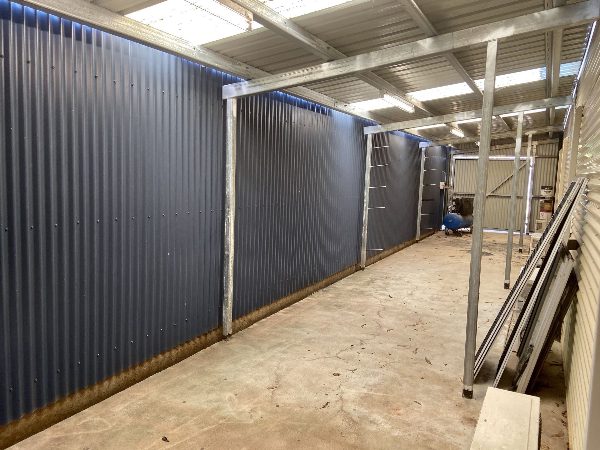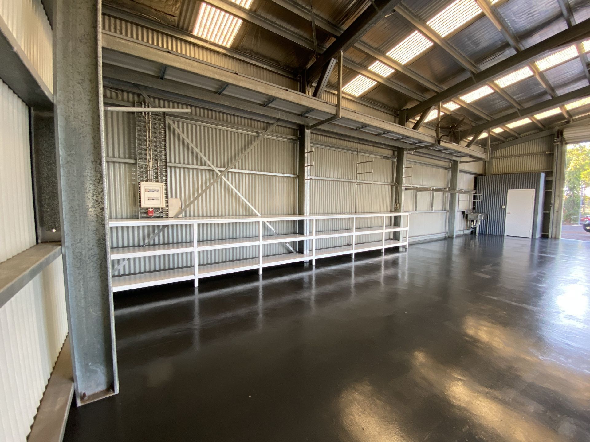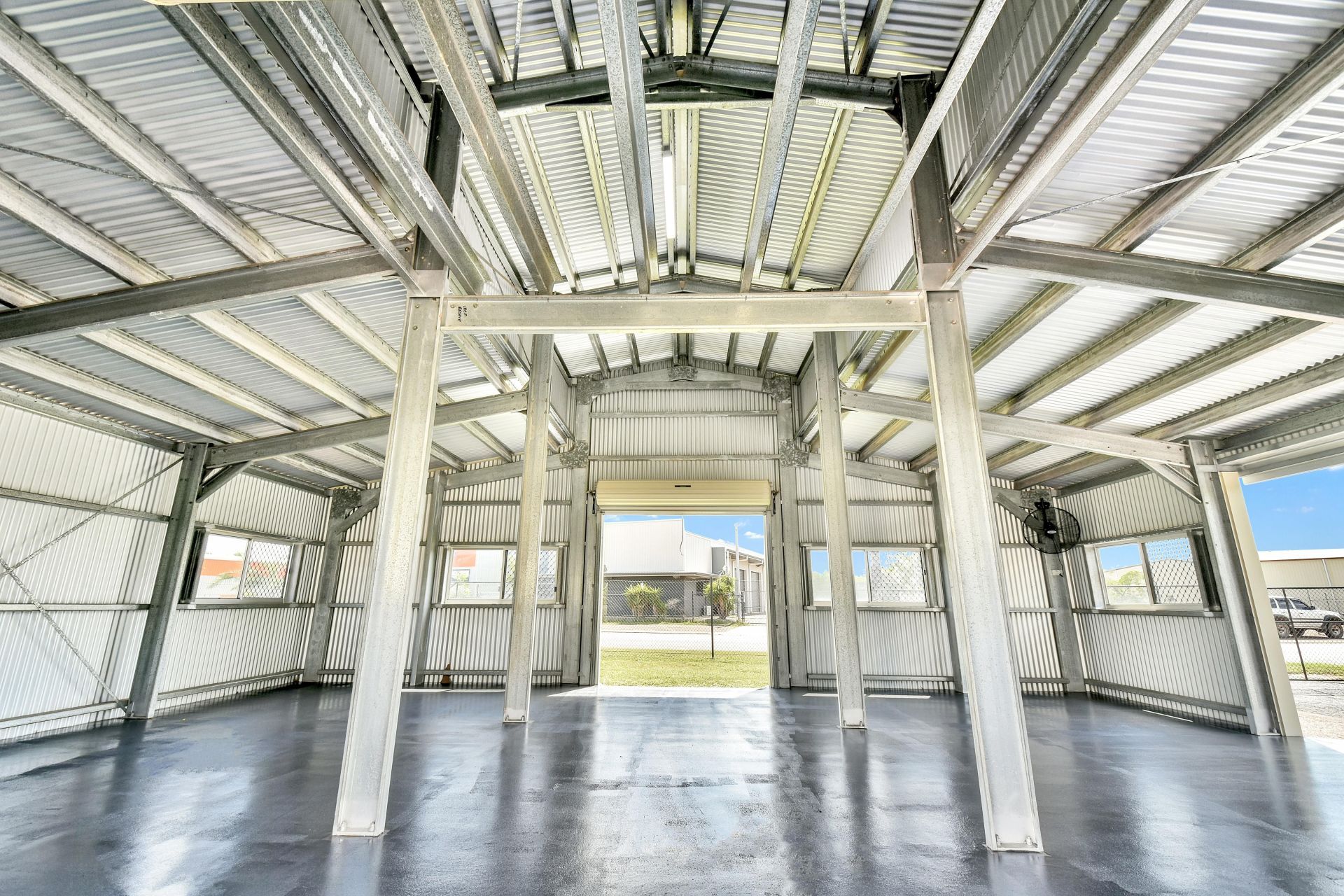 Description: The gara port benefits from cross-flow ventilation due to a large number of openings, such as a roller door (2500mm x 2500mm), one commercial sliding door (2200mm x 3000mm), and a double opening personal access door (1640mm x 2040mm). The shed is fully lockable. The shed features three GPOs, an oscillating fan, and extensive interior and exterior security lights. This space can comfortably park two vehicles.