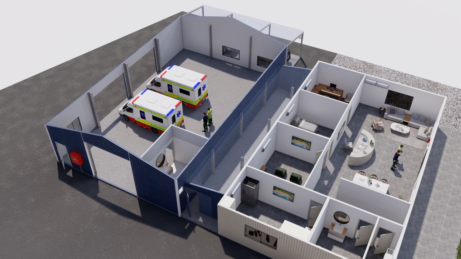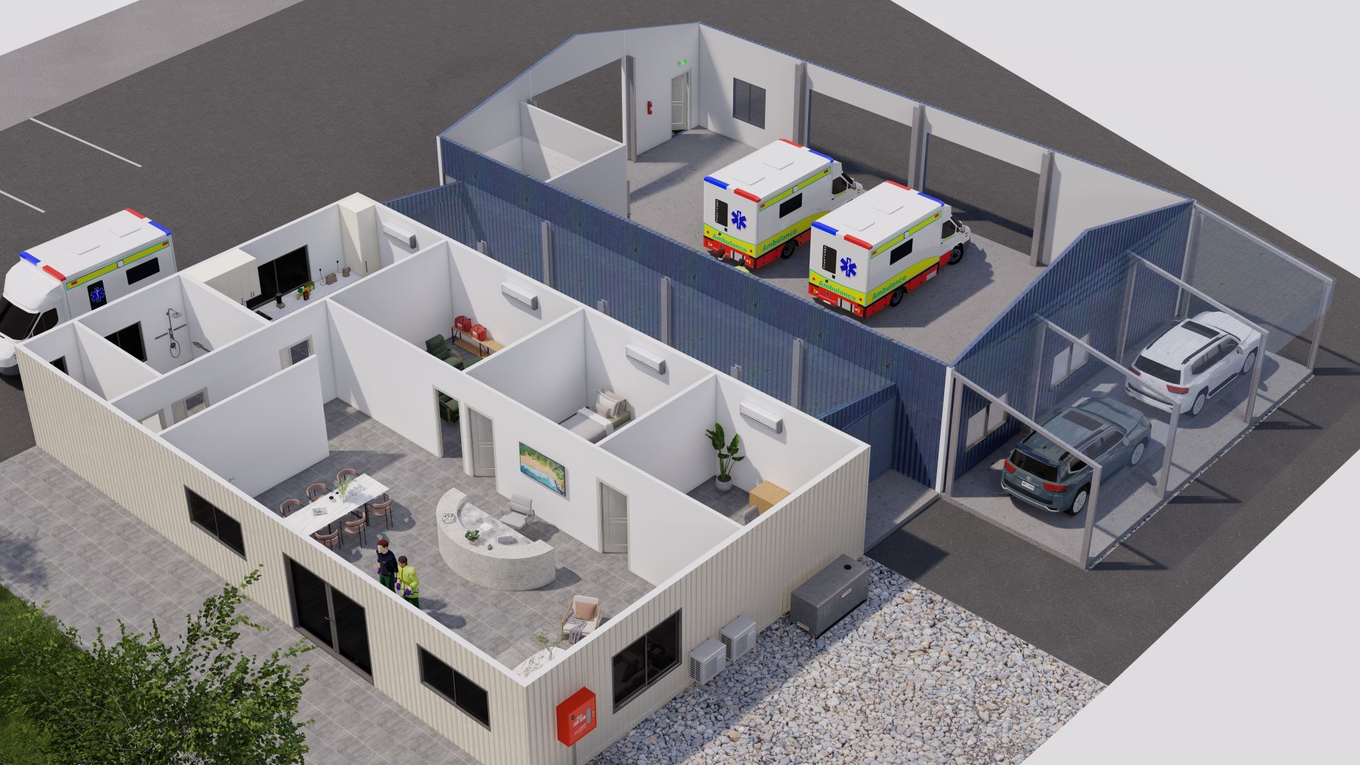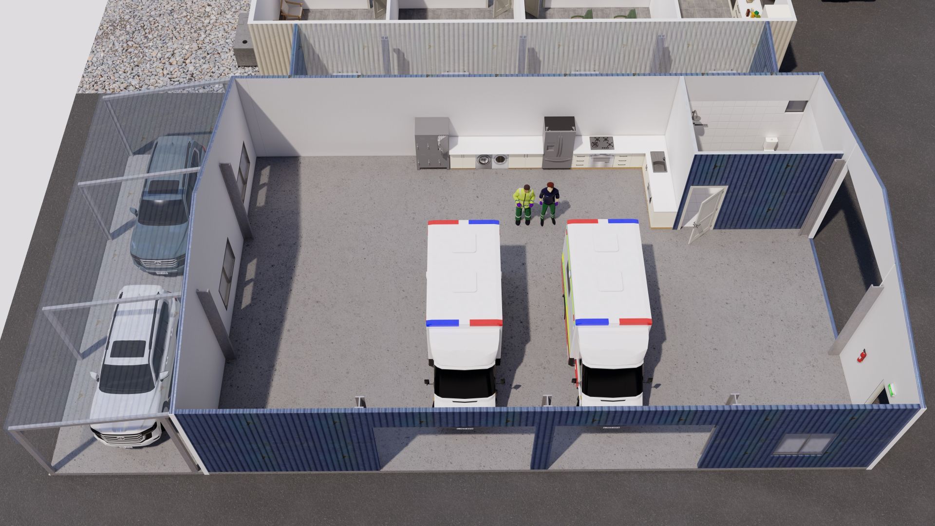 Description: The gara port benefits from cross-flow ventilation due to a large number of openings, such as a roller door (2500mm x 2500mm), one commercial sliding door (2200mm x 3000mm), and a double opening personal access door (1640mm x 2040mm). The shed is fully lockable. The shed features three GPOs, an oscillating fan, and extensive interior and exterior security lights. This space can comfortably park two vehicles.