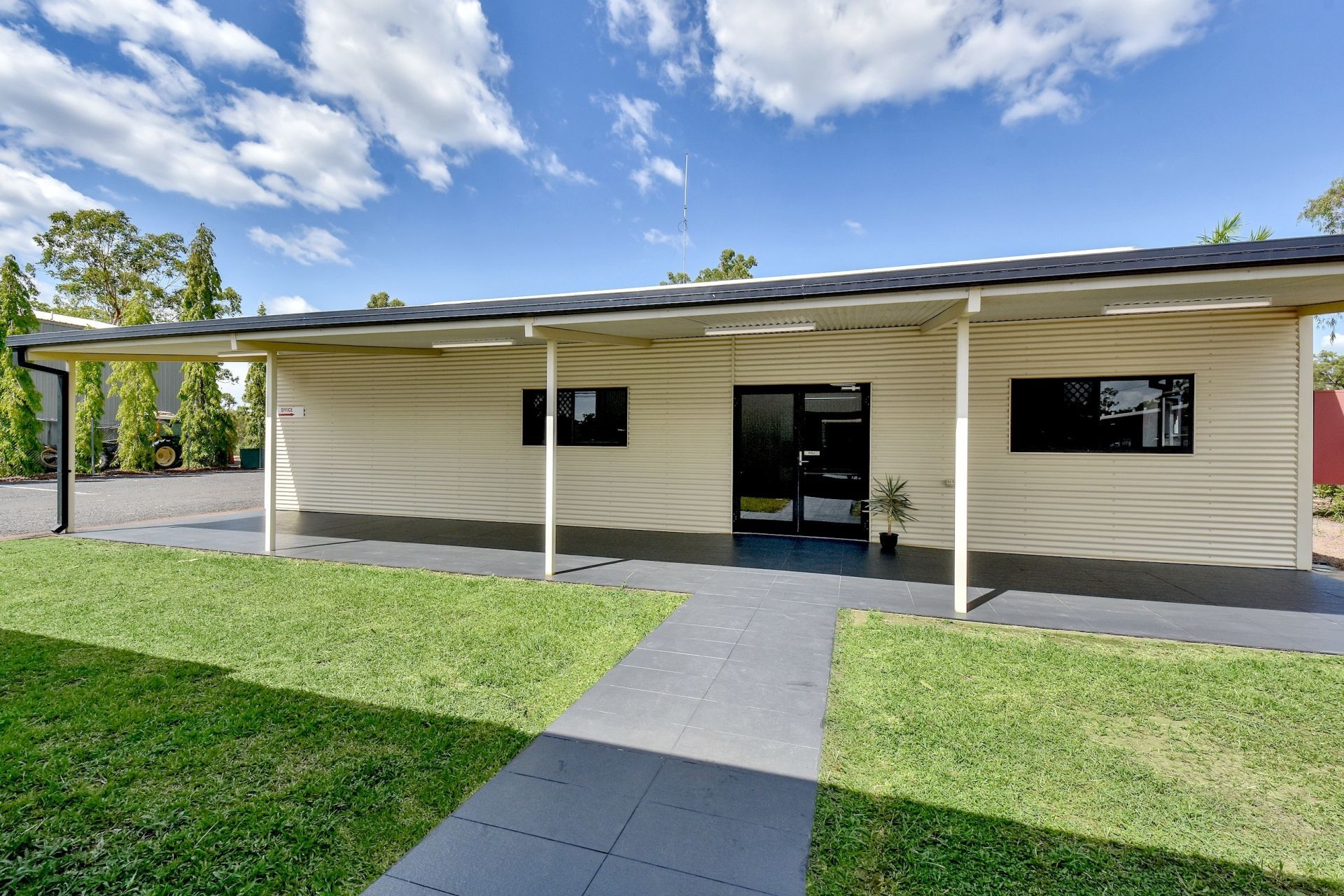 Description: The office building features a large foyer/reception area with a cathedral ceiling, three large offices, a kitchen lunchroom, a file storage room, and a spacious bathroom with a shower. The office building has new air-conditioners throughout. The office building has a professional CCTV system with 5x outdoor dome cameras (30fs), split screen monitor, UPS, and Video Recorder. Attached to the office, is a large tiled verandah. There is a floor plan of the office included in the listing's photos.