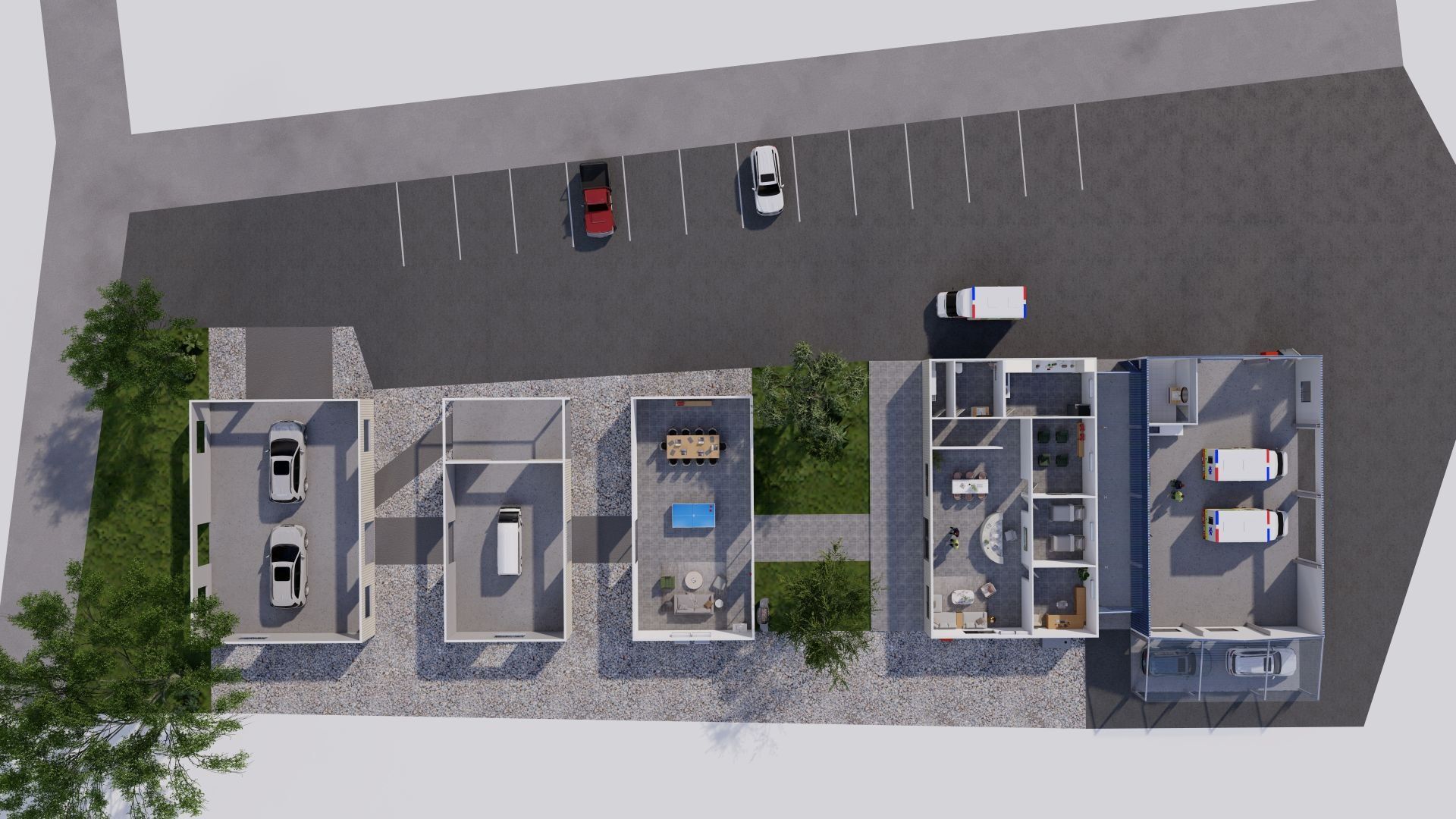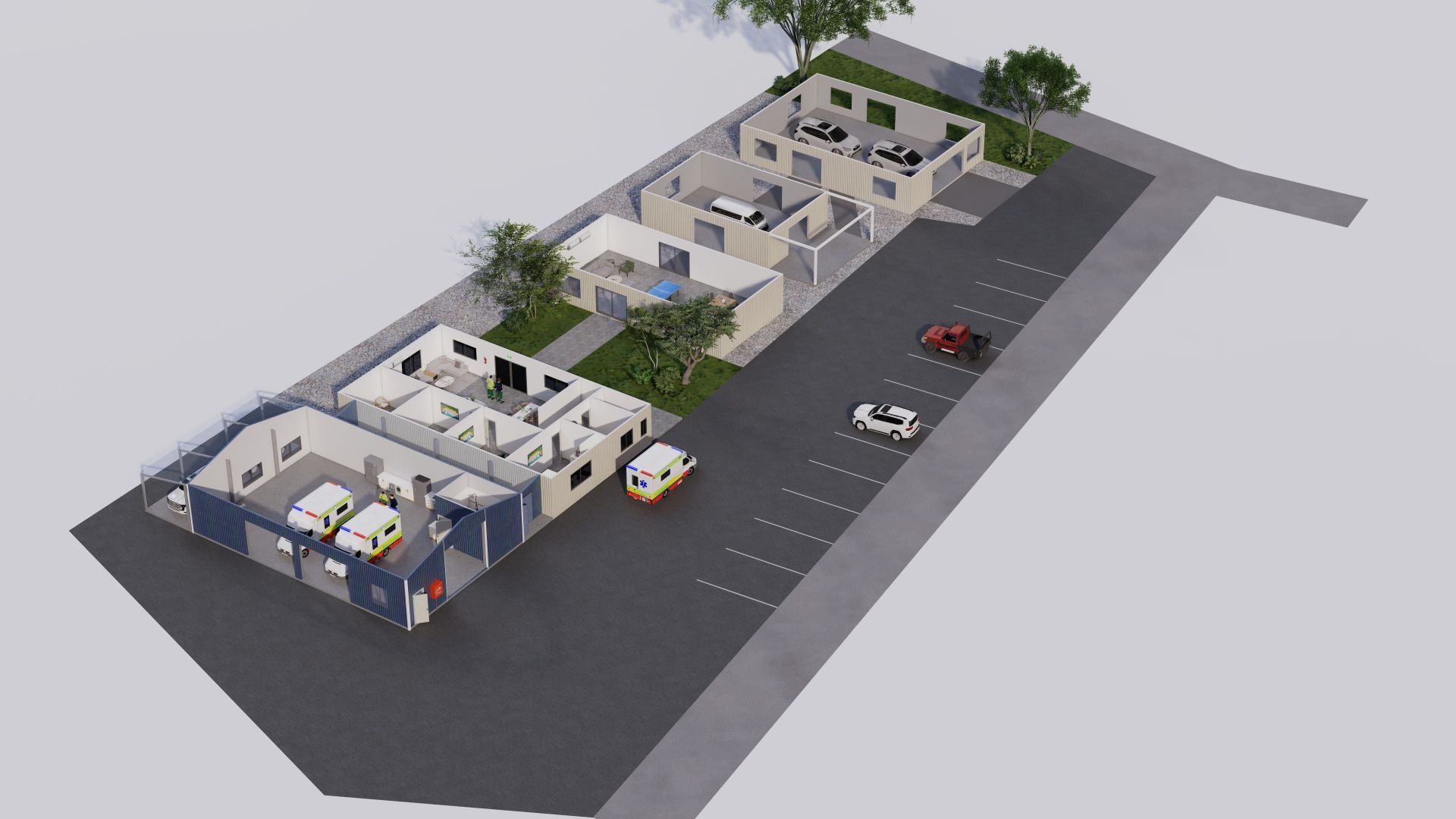 THE PROPERTY FEATURES A LARGE OFFICE BUILDING AND FOUR SHEDS