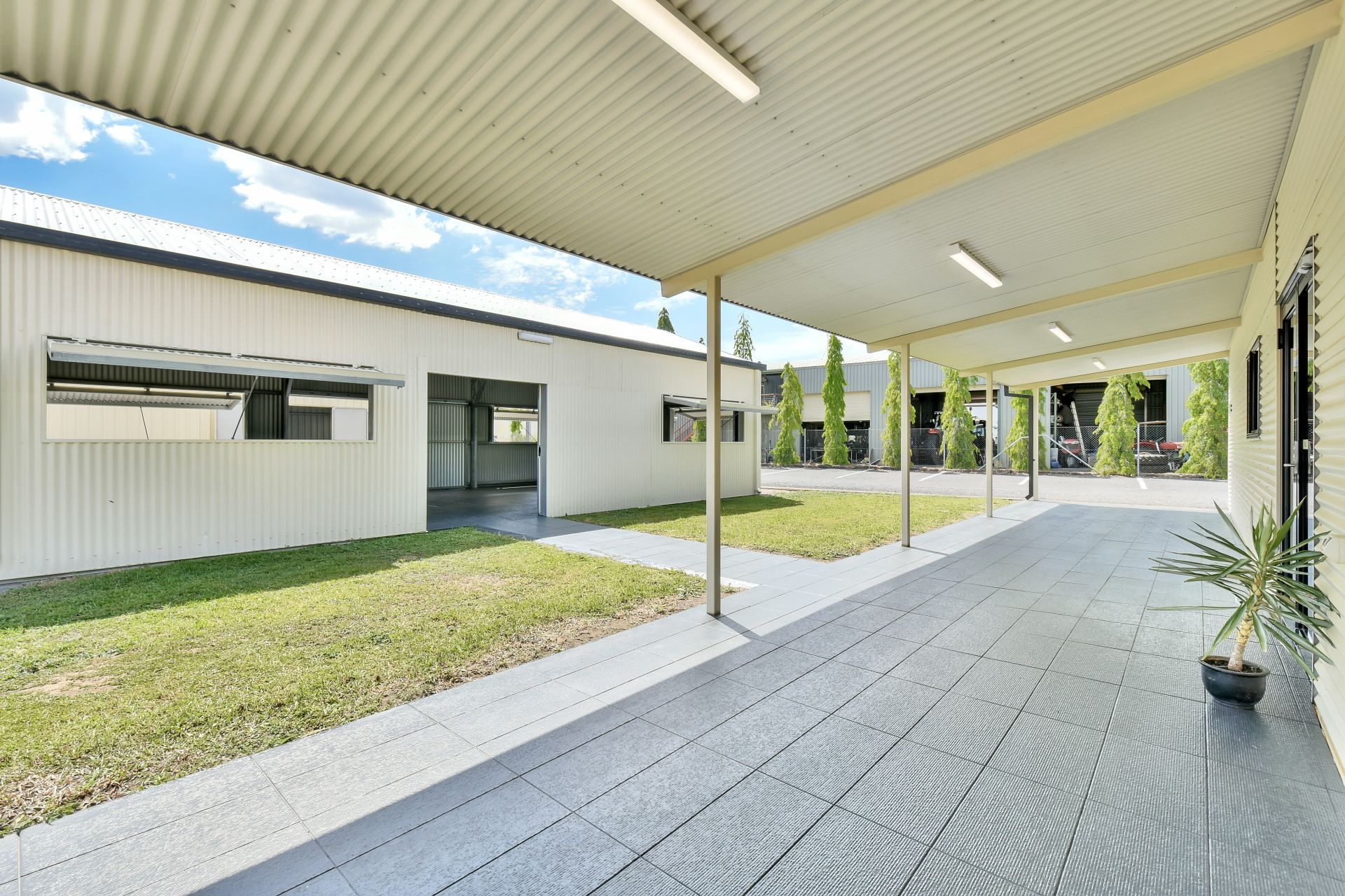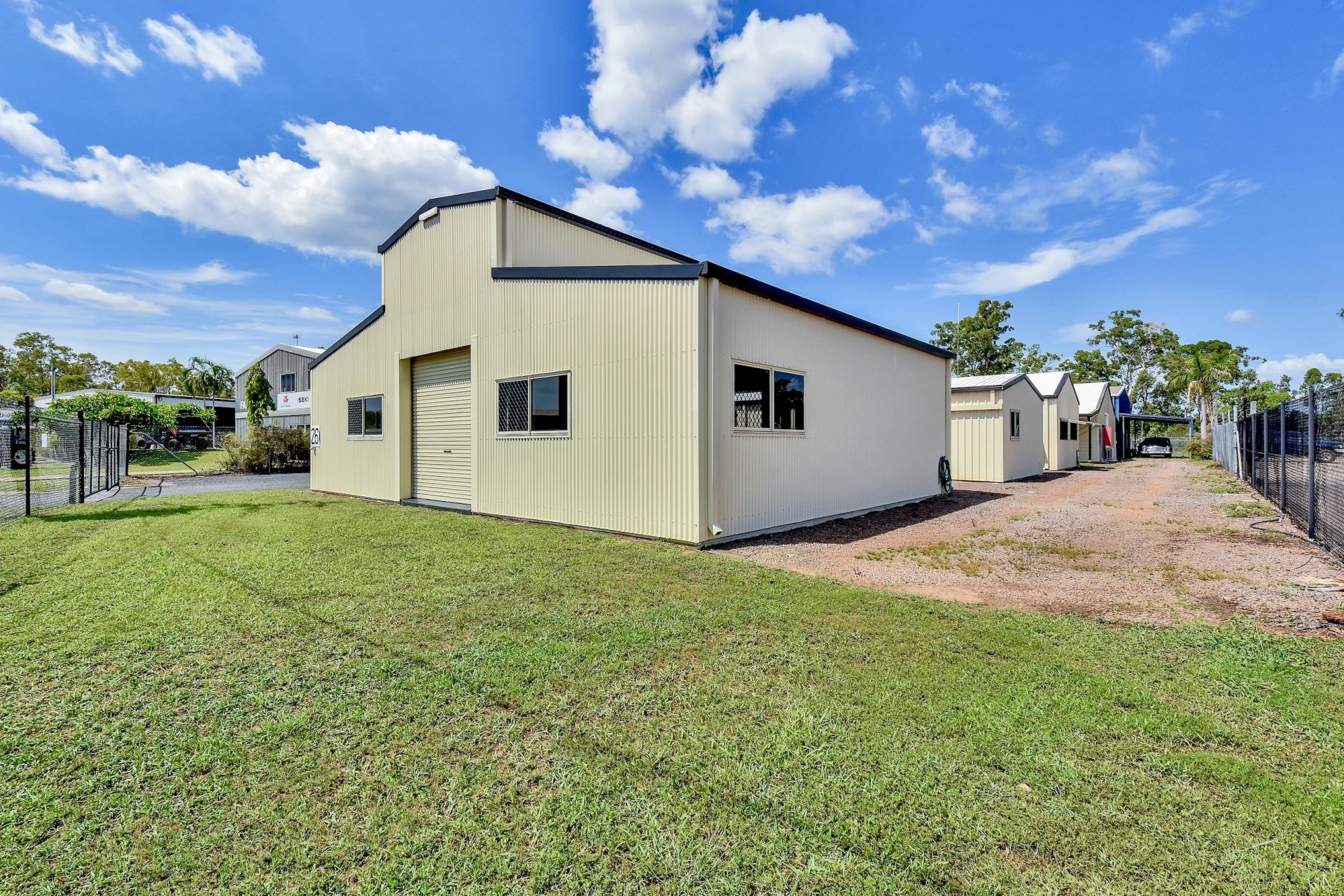 Description: The American barn has road frontage to Vereker Street. A large number of openings in this shed gives it great cross-flow ventilation, this shed features six sliding windows with security screens. The shed is accessible by a personal access door, two roller doors (2700mm x 2700mm), and one large steel commercial sliding door (3000mm x 3000mm), which opens directly onto the driveway). In front of the commercial sliding door is a concrete ramp from the driveway, for easy access. The shed is fully lockable. The shed features GPOs, two wall-mounted oscillating fans as well as extensive interior and exterior security lighting.