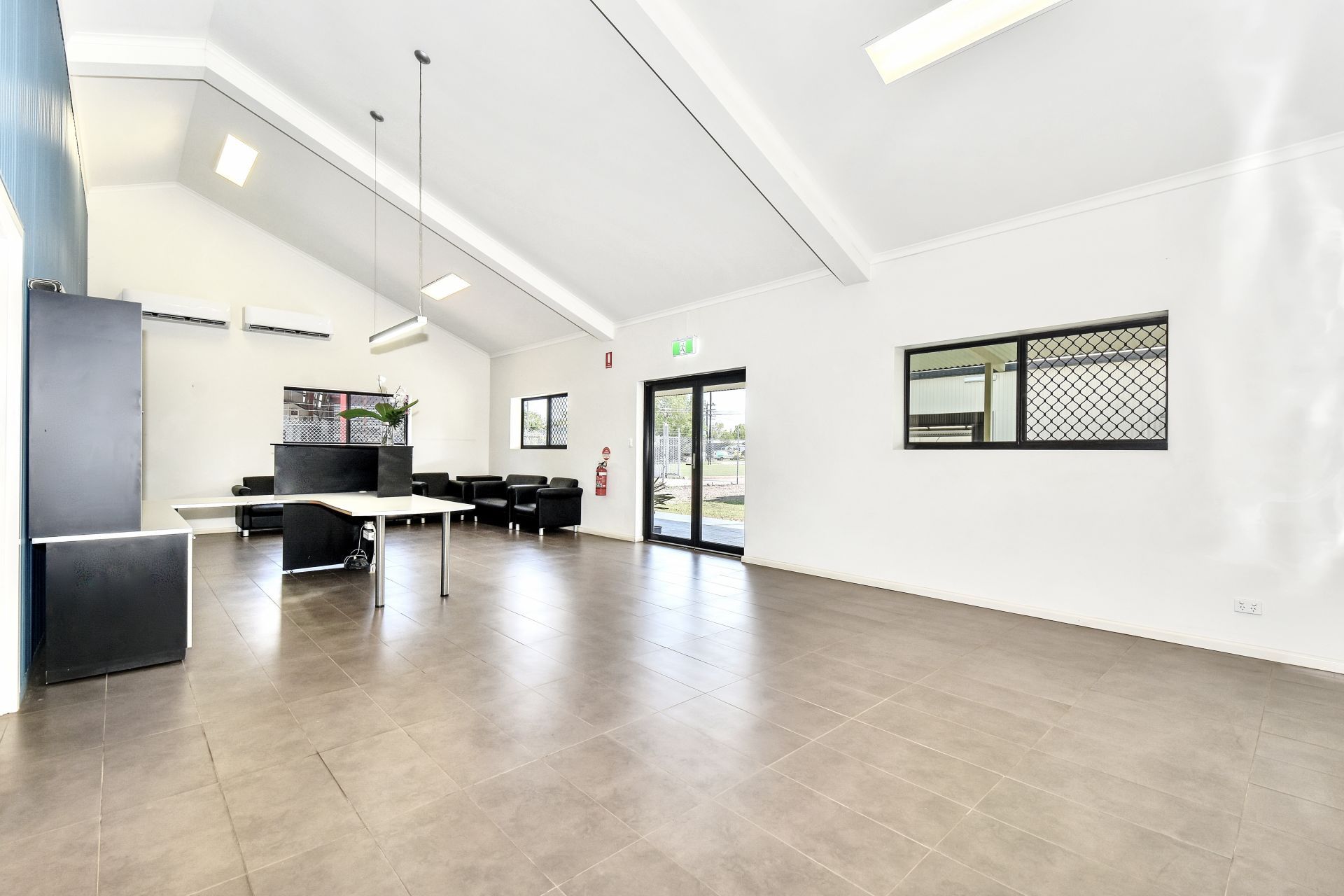 Description: The entertainment area benefits from cross-flow ventilation, with eight 'push-out' steel hopper windows and two commercial sliding doors (3600mm x 2100mm). The shed is fully lockable. There are three GPOs, as well as extensive interior and exterior security lights. For heat mitigation, the ceiling features insulation, there are also two ceiling fans and two wall-mounted oscillating fans. This entertainment area is a comfortable space for Toolbox talks, BBQs, or presentations.