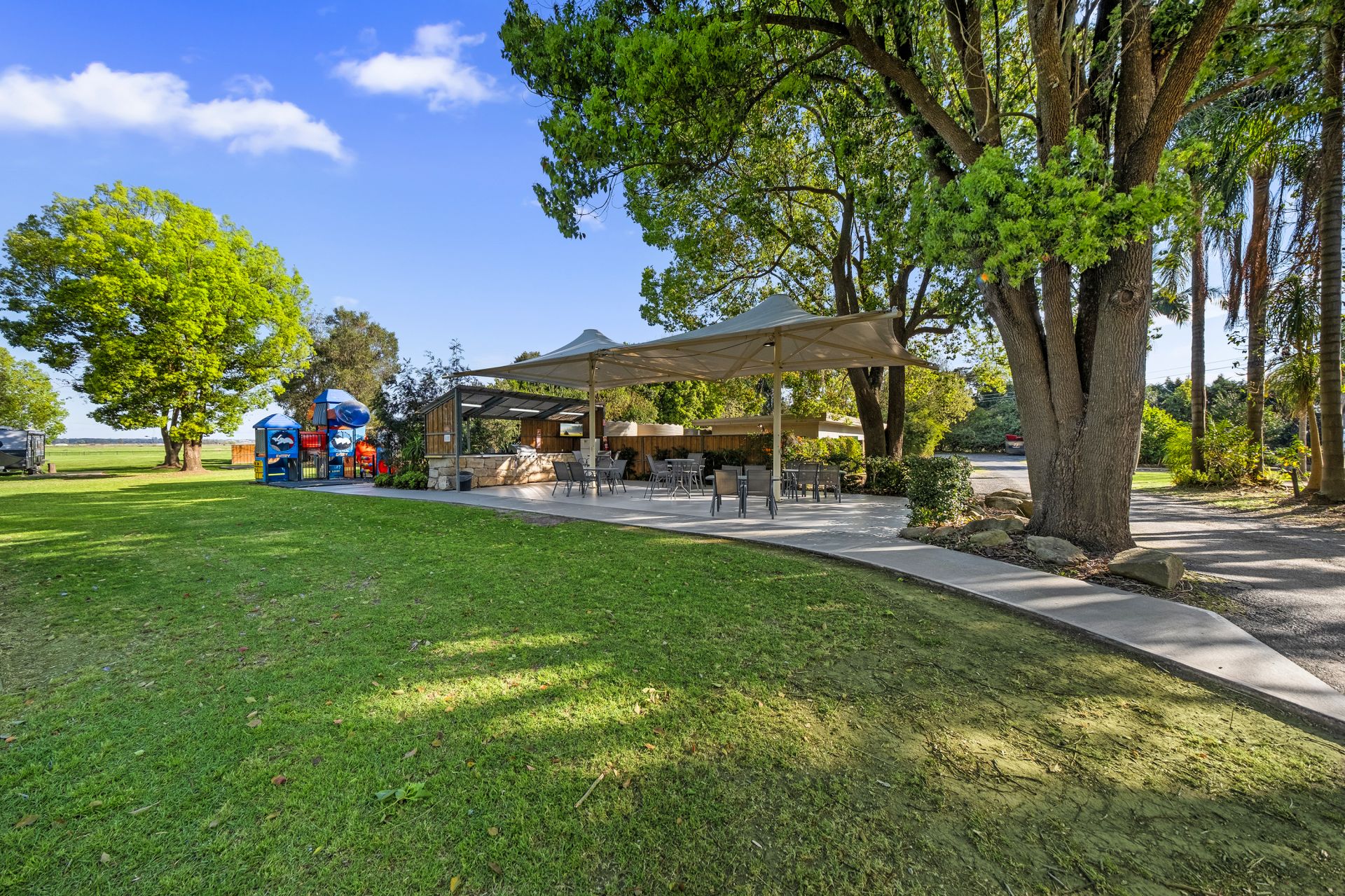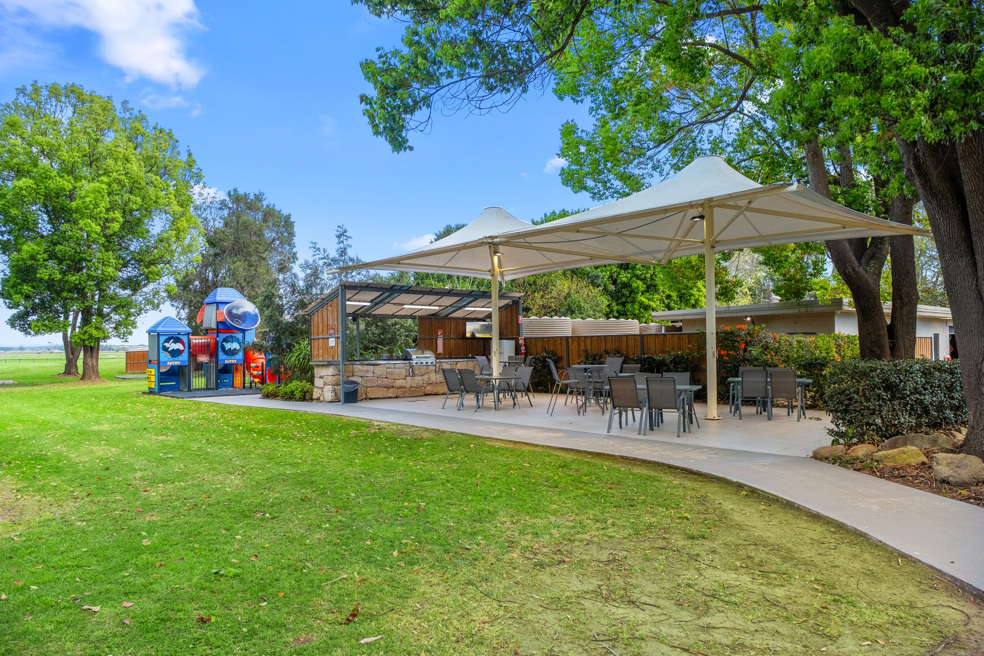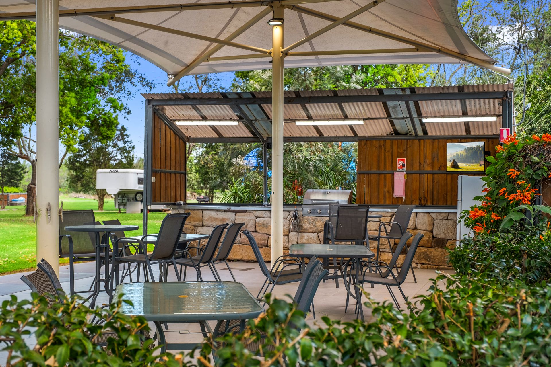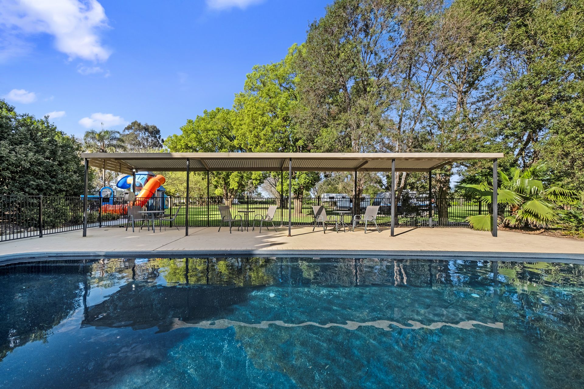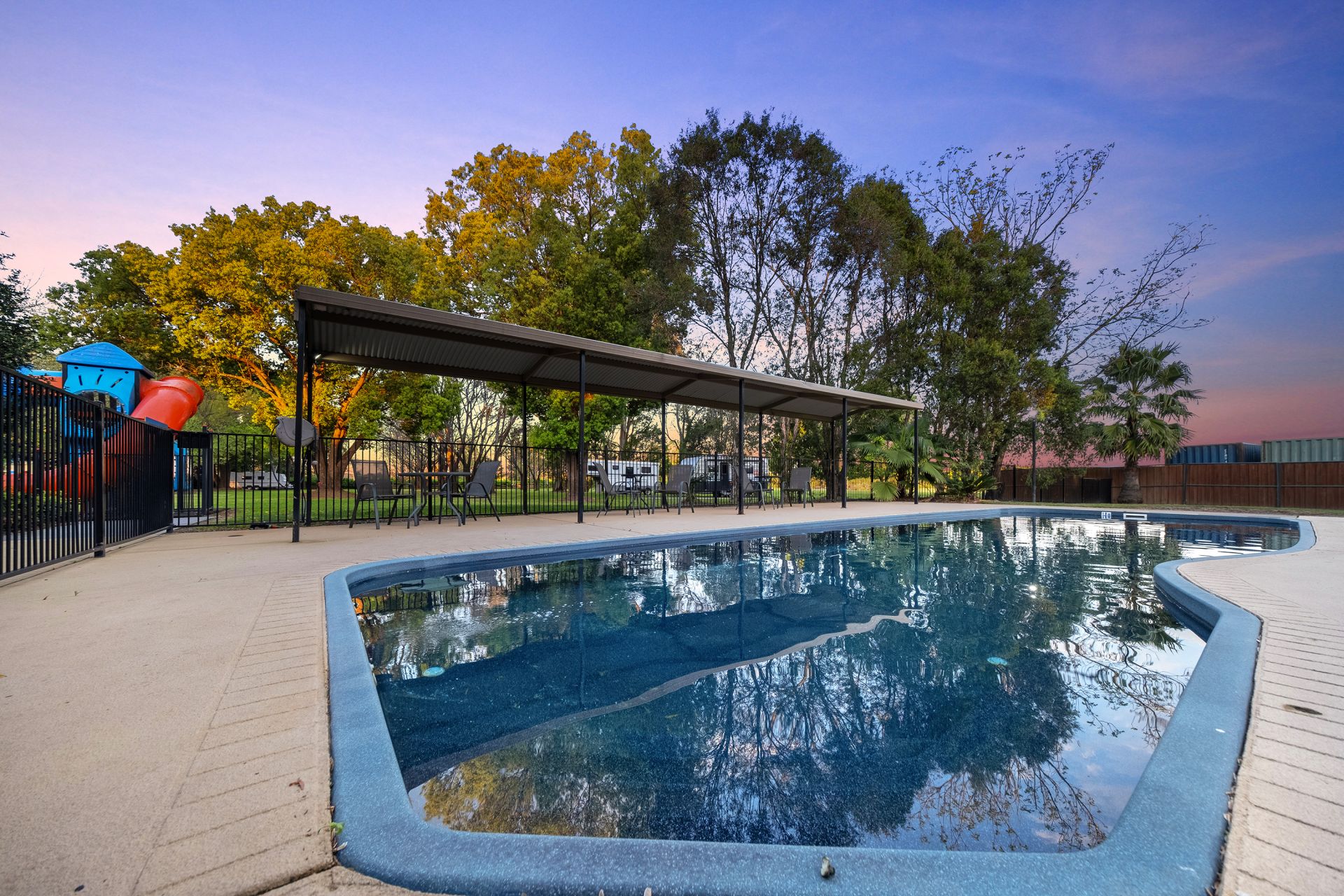 Entertain guests in the all-seasons undercover area or enjoy a BBQ by the river with a dedicated viewing deck crowning the sandstone block landscaped terraces. Additional highlights include a large equipment shed, wash bay, dump point, guest laundry services, and male and female bathroom facilities.