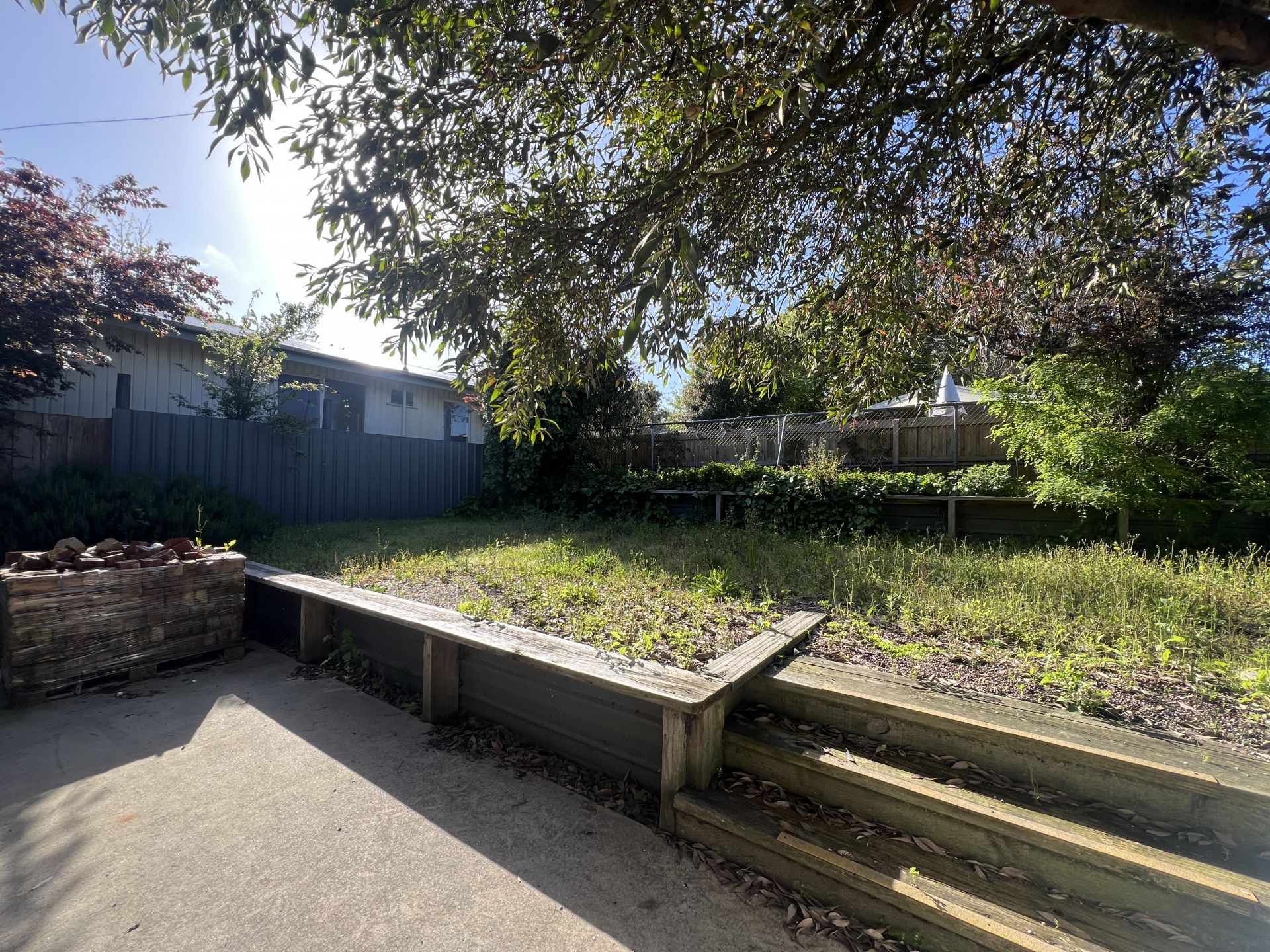 • Usable area: A combination of tiered concrete zones and terraced lawn, well-proportioned and adaptable for a variety of layouts and functions.